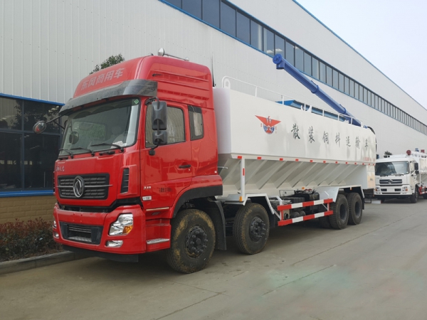 液壓式散裝飼料車的飼料罐架設在卡車的底盤上,專用設施由罐體總成、輸送系統(水平卸料系統、垂直卸料系統以及活動卸料系統組成)、液壓系統(高壓油泵經管路與分配閥連接該閥的三個輸出端分別是轉角液壓馬達、升降油缸以及串聯在一起的水平卸料、垂直卸料、活動卸料液壓馬達)、電動系統、氣動分倉機構等組成。在罐體底部設有閘門,在閘門下面裝有水平螺旋輸送器(俗稱水平攪籠),由取力器由汽車變速箱輸出動力驅動,再傳動高壓油泵以驅動液壓系統,液壓馬達通過傳動裝置帶動水平螺旋輸送器的葉片軸及葉片旋轉, 經活動輸送系統(俗稱活動攪籠)以將飼料輸出。車頂平置的一根活動卸料絞龍可自由回轉和抬升,運輸時,頂部的螺旋管平臥在罐頂;卸料時則抬起,使管端的出料口與畜禽飼養場貯料罐頂部的進料門相接、對準,完成卸料。電動絞龍散裝飼料運輸車是針對不同客戶群最新研發的、滿足低端市場的新產品,該車不配車載發電機,電動絞龍利用市電三相380V來供電,車輪距較小能適應農村鄉間道路。該車性價比高很受客戶的青睞,適用于路況狹小的小型養殖場、飼料廠。采用機械螺旋的卸料方式,卸料速度快,可連續作業,大大提高生產效率。罐體可分隔成二至四倉,同時裝載不同飼料;各部件結構簡單,操作方便靈活,易于維修保養。