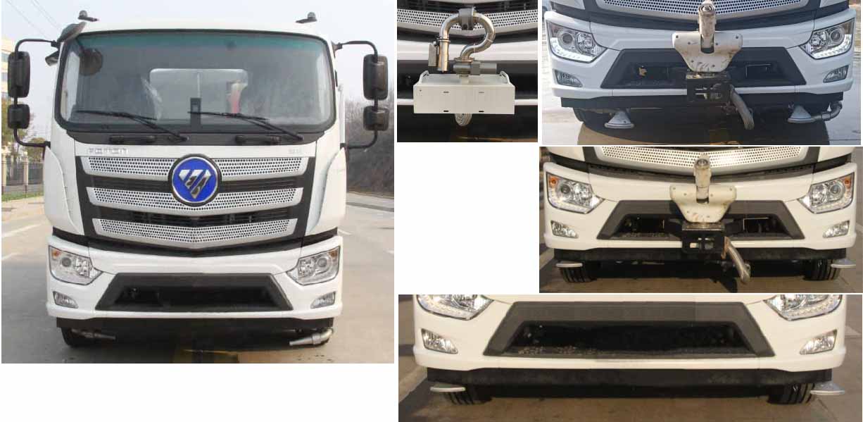 該車主要用于城鄉園林綠化,路面噴灑;主要裝置為罐體及噴灑裝置.罐體總容量:10.6立方米;罐體有效容積10.1立方米;介質:丙酮水溶液,密度950千克/立方米,罐體外形尺寸(長×長軸×短軸)(mm):4600×2300×1450.側防護采用電池護罩代替,材料為Q235碳鋼,螺栓連接;后防護材料為:Q235碳鋼,連接方式為:螺栓連接,后部防護截面尺寸(mm):120×50,后部防護離地高度(mm):490;ABS型號/生產企業:ABS-E/采埃孚商用車系統(青島)有限公司;電池種類:磷酸鐵鋰電池,儲能裝置單體生產企業:寧德時代新能源科技股份有限公司,儲能裝置總成生產企業:寧德時代新能源科技股份有限公司;電機型號/生產企業:TZ375XSSF-SZF611/陜西法士特齒輪有限責任公司,額定功率:105kW,峰值功率:175kW.選裝前部電子水炮樣式,選裝前部不帶電子水炮,該狀態下車長為8100mm;當前部安裝電子水炮時,車長為8600mm,車輛前伸500mm.后部箭頭指示燈僅在車輛作業時開啟.選裝車輛前部鴨嘴裝置. |