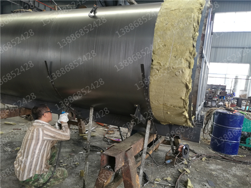 3. 保層溫的制作是在水罐外部另外焊接10mm厚的支撐骨架,然后用保溫材料將骨架內部填充滿,**在骨架外蒙上一層外皮。 保溫層外表鐵皮采用8mm厚高強度耐磨板,可選擇使用不銹鋼分鏡面8K或磨砂板