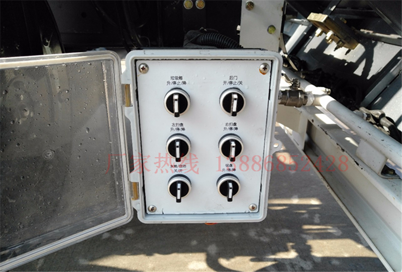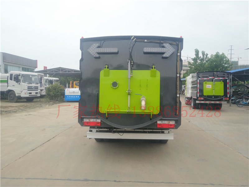 廂體采用傾翻卸料,帶高壓沖洗自潔裝置。垃圾箱自潔裝置可在垃圾箱卸料時幫助卸料,沖洗附著在箱體內(nèi)壁上的殘留垃圾。