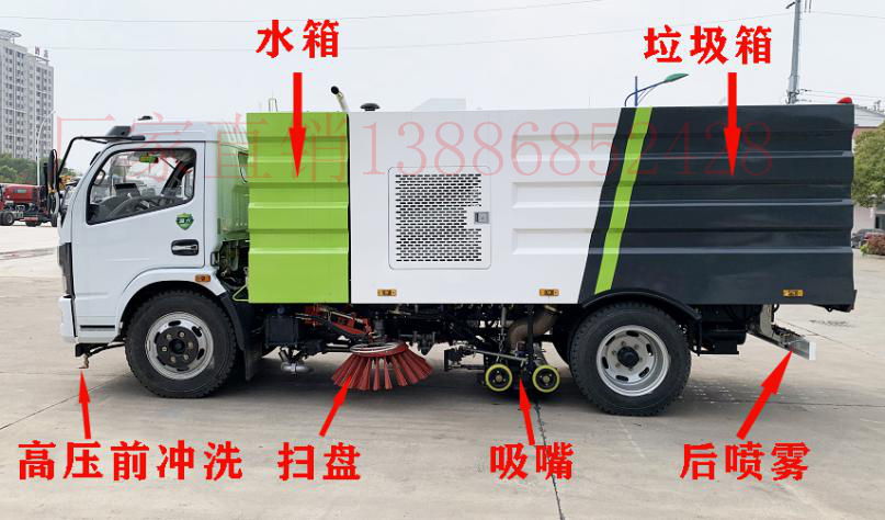 該洗掃車采用東風多利卡國六二類底盤改裝,加裝副發(fā)動機、風機、清水箱、垃圾箱、左右立掃、掃盤降塵系統(tǒng)、左右高壓側(cè)噴高、吸盤內(nèi)置高壓主噴桿、氣動系統(tǒng)、液壓系統(tǒng)、專用裝置電控系統(tǒng)和副車架等改裝而成。