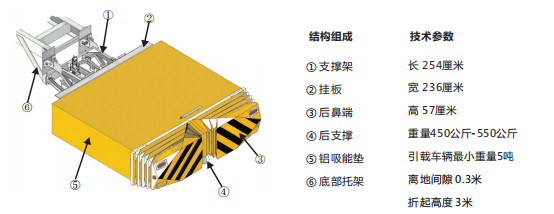 該防撞緩沖車(chē)上裝部分主要由貨箱總成、誘導(dǎo)組合燈、防撞緩沖模塊、液壓系統(tǒng)和電氣系統(tǒng)組成,通過(guò)油路控制防撞緩沖模塊升降,工作狀態(tài)下防撞模塊處于降落水平狀態(tài)。